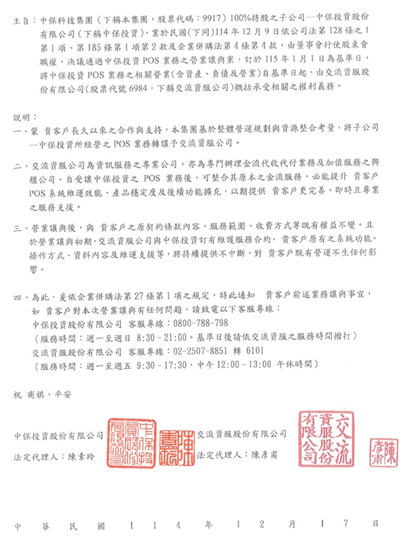 A:您好,感謝您的詢問。因應中保科技集團基於整體營運規劃與資源整合考量,訂於民國115年1月1日(下稱基準日)起,將中保投資股份有限公司(下稱中保投資)原提供之「開店快手-雲端POS店管系統」服務,業務轉讓予交流資服股份有限公司(下稱交流資服公司)繼續提供服務,但不會影響您目前的服務與權益。